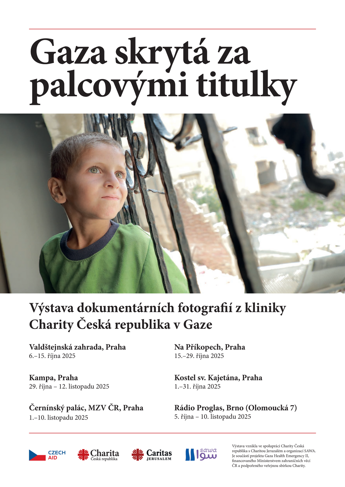 Putovní výstava s názvem Gaza skrytá za palcovými titulky přiblíží v říjnu a listopadu návštěvníkům v Praze a v Brně prostředí charitní kliniky v Pásmu Gazy. Dokumentární fotografie, vzniklé ve spolupráci s místními pracovníky, zachycují silné civilní příběhy lidí, jimž společný projekt Charity Česká republika, Charity Jeruzalém a organizace Sawa pomáhá navracet nejen zdraví, ale i důstojnost a naději. Série autentických snímků, které byly pořízeny v srpnu letošního roku, vznikla jako doprovodný dokumentární materiál k projektu Gaza Health Emergency Project II, který zajišťuje základní zdravotní péči, psychologickou podporu prostřednictvím bezplatné krizové linky (zajišťované organizací Sawa) a individuální sociální poradenství. Projekt je realizován s podporou Ministerstva zahraničních věcí ČR a dárců veřejné sbírky Charita pro Gazu.